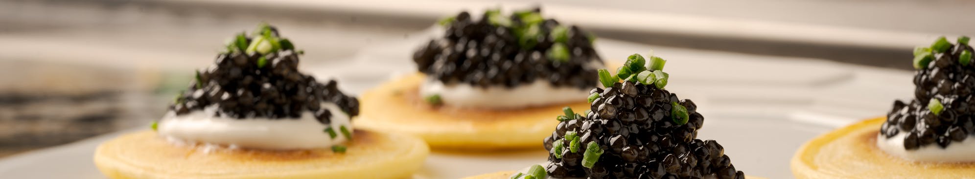 Market Caviar, Blini, Creme Fraiche, Farm-Fresh Boiled Egg, Chives, Capers, Shallots