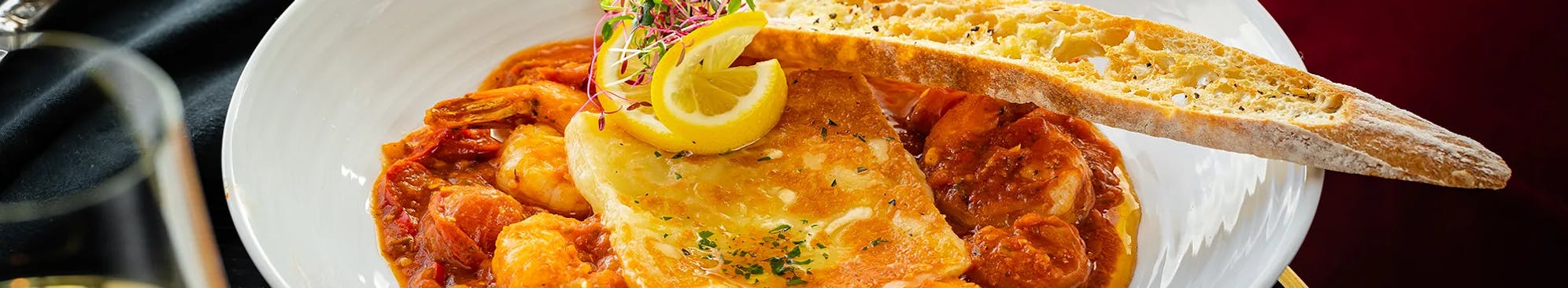 Garlic Butter Shrimp, Torched Cheese, Lemon, Herbs, Grilled Baguette